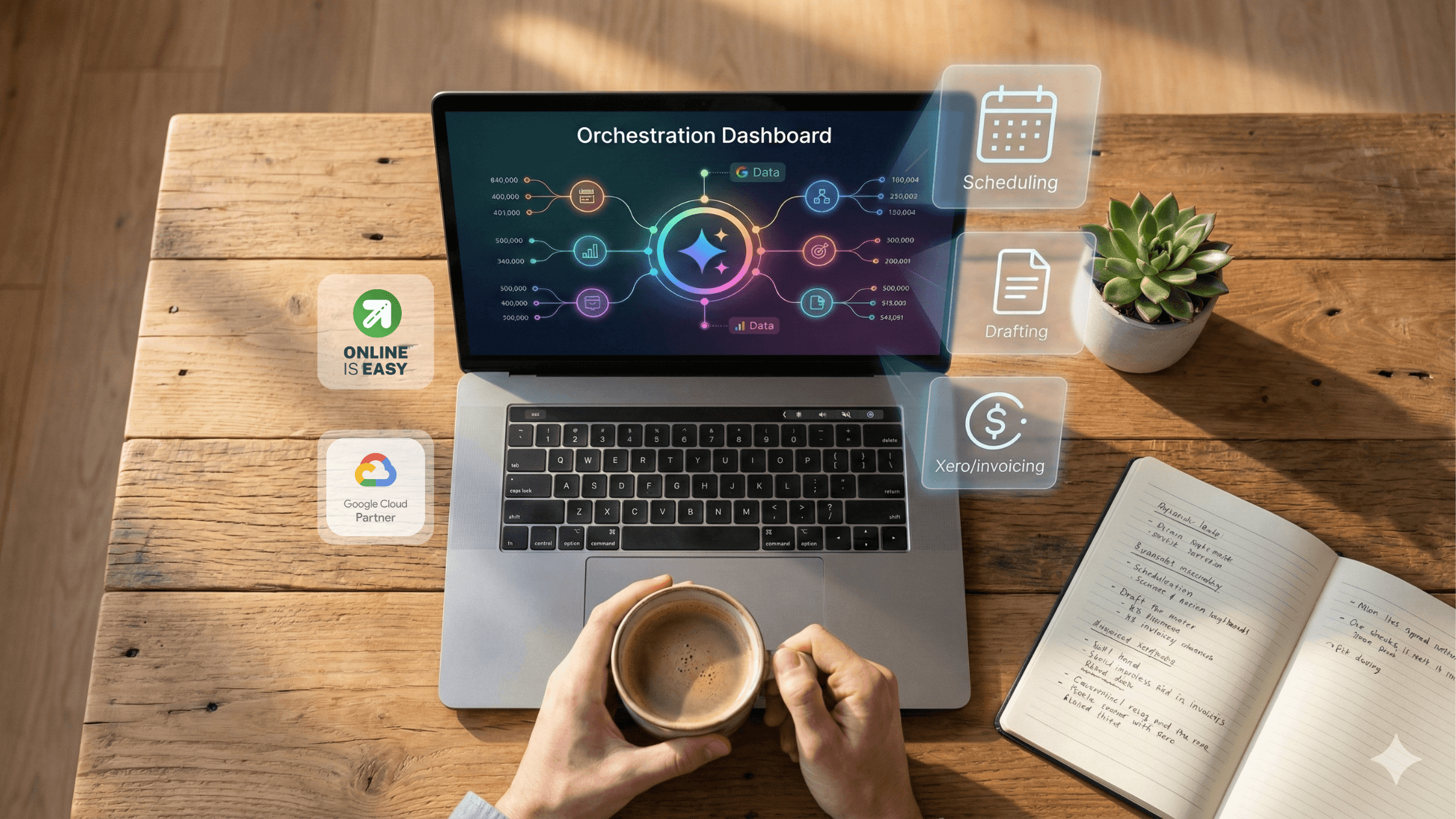 It is the use of AI "agents" to coordinate multiple tasks across different platforms -- like Xero, Gmail, and your website -- to complete complex workflows without manual intervention.